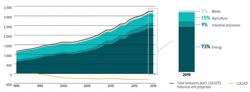 रिपोर्ट के अनुसार, भूमि उपयोग, भूमि उपयोग परिवर्तन और वानिकी (एलयूएलयूसीएफ) को छोड़कर, 1990 से 2019 के बीच भारत के कुल ग्रीनहाउस गैस उत्सर्जन में 182% की वृद्धि हुई है। इसी अवधि में, (एलयूएलयूसीएफ को छोड़कर) इसके कुल मीथेन उत्सर्जन में 10% की वृद्धि हुई है।