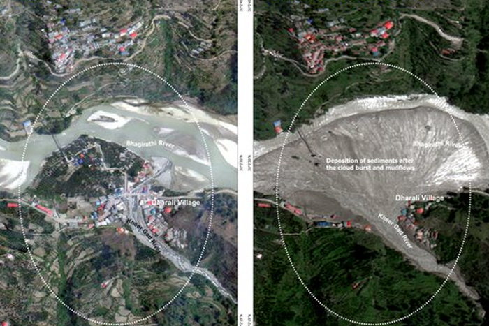 इस बीच, हैदराबाद-स्थित नेशनल रिमोट सेंसिंग सेंटर (एनआरएससी) ने आपदा के पहले और आपदा के बाद की सैटेलाइट तस्वीरें जारी की हैं जिनसे पता चलता है कि बाढ़ से धराली को कितना नुकसान पहुंचा है। तस्वीरों में धाराली गांव मलबे और कीचड़ में दबा दिख रहा है, जहां इमारतें, सड़कें और बगीचे डूब गए हैं।